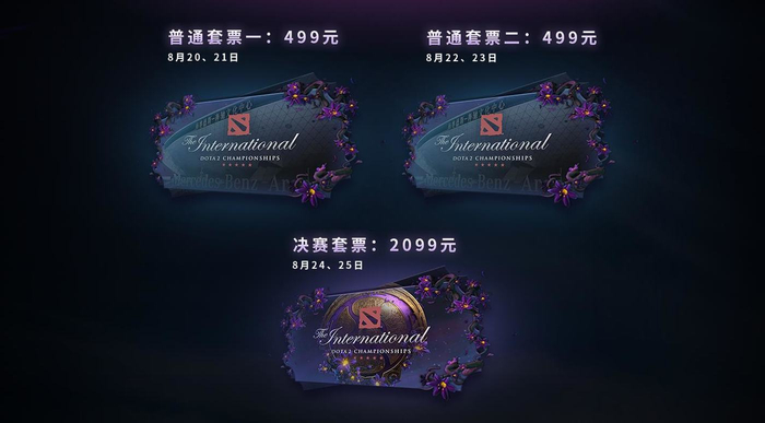 本次TI9的门票,工作日的套票价格为499元人民币一张,在最后的8月24日-8月25日的决赛日套票,价格则为2099元人民币,一张套票限一人入场。
