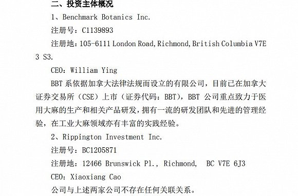 上述合资公司暂定名YATAI & BBT Biotech Ltd.,其将在符合加拿大大麻法规的前提下,以推动高含量 CBD(大麻二酚)工业大麻的培育、种植、加工、销售和医用大麻的种植、研发以及高纯度 CBD 为主的大麻素的萃取、分离、提纯及其多领域的商业化应用。