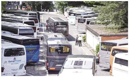 图为瑞士当地为接待婕斯旅游团,旅游巴士排起长龙。