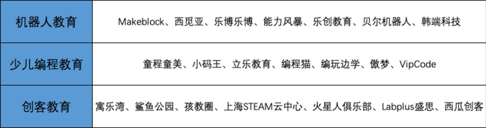 与其他教育形式一样,同样依赖政策的STEAM教育市场也终于兴起,2015年后涌现出一大批初创公司。从课程类别上看,这些STEAM教育领域的初创公司主要集中在机器人教育、少儿编程教育和创客教育三条赛道上。