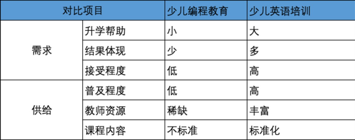 少儿编程教育常常会被拿来与同属K12教育的少儿英语培训对比,后者目前的市场容量在600亿左右,行业内也已培育出像VIPKID这样的独角兽企业。不过相比于少儿英语培训市场,尚未与应试教育挂钩的少儿编程教育对升学的帮助极有限,结果体现少也让大家长的接受程度还比较低,毕竟让孩子学习任何技能都是有机会成本的。