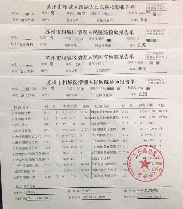 王新伟就诊的相城区漕湖人民医院院长办公室的工作人员对记者说,患者来医院时被判定为肠道感染,不清楚患者此前是否使用过其他致敏食物。该工作人员还强调,医院此前未遇到过类似情况。
