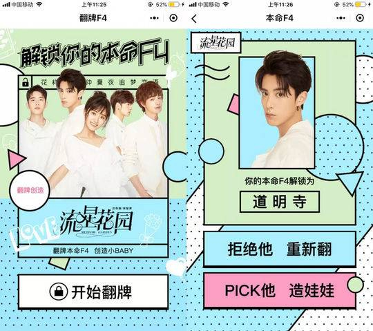 2018年,在电视剧新版「流星花园」热播期间,芒果娱乐独立开发了「流星花园翻牌F4」和「流星花园土味情话考试」2款小程序,前者侧重于电视剧的辅助营销宣传,后者则是团队自主策划、长线运营的产品。