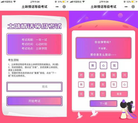 罗伟:去年很流行土味情话,我们就在网上搜集了一波后做成了基础题库,用等级考试的形式,让用户看看自己到底有多「土」,能不能接住一些梗。