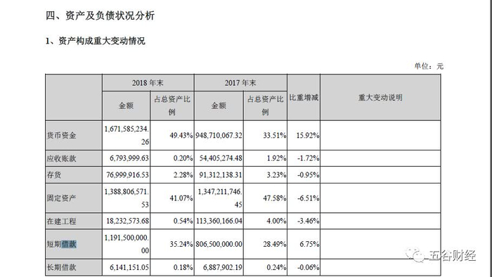 就在货币资金大幅增长的同时,截止2018年末,科迪乳业的有息负债余额接近12亿元(其中短期借款接近11.92亿元),同比增幅在47%以上,占总资产的35%左右。