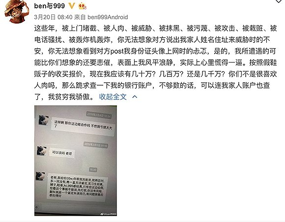 网上常能看到一些用户,一言不合就对球鞋鉴定师口诛笔伐。“球鞋鉴定得太慢了!”、“假的却鉴定为真(或反之),水平真次”等,甚至有些鉴定师会面临人身威胁,成为“高危职业”。比如,今年3月,知名体育博主Ben神,就发帖表达过自己的职业困境: