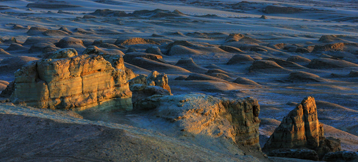 穿过冷湖镇,前往“火星营地”还有半小时左右的车程,途中经过一片体量宏大的城镇废墟,便是上世纪五六十年代工业聚落的遗址。当年驻扎油田的工人陆续搬走时,房屋上能再回收利用的梁架与门窗都被拆下带走了,只留下砖墙历经风雨磨蚀,满目层层叠叠的门洞和街巷。正在疾速沙化、模糊不清的建筑体交错勾勒出以往工业聚落的繁盛图景,墙壁上零星出现的过去住家厨房里的挂钩等小物价,密语一般向你打开一道窥看人间生活的缝隙。来来往往很多回了,废墟仍让高峻岭触动,站在废墟上以回旋的方式观看,不禁感叹:“资源耗竭之后,我们的未来会在哪里?这里既是尽头,又是未来的起点,好像人类境况的真实隐喻。”
