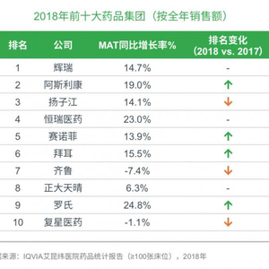 根据IQVIA艾昆纬报告《2018年中国医药市场回顾》,医院药品统计报告(≥100张床位),2018年中国医院药品市场总销售额达到7718亿人民币,全年增长3.3%。跨国药企和本土药企全年销售额分别为2084亿和5634亿人民币。