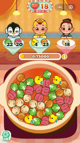 同时,《火锅》还深化了消除类游戏常规的收集订单玩法,在火锅消除区域旁边坐着4位客人,他们会要求消除特定类型、特定数量的涮菜,为玩家提供更直接的短期目标,完成目标后会反馈金币奖励,使玩家能更快通关。在普通客人中,还夹带了一些具备特殊能力的客人,他们还会为关卡带来更丰富的变化。比如当小孩出现时,会将一些橡皮鸭子扔到锅里,将原本相邻的涮菜隔断,玩家需要在橡皮鸭子边缘完成相应次数的连消以后才能收集到它们。