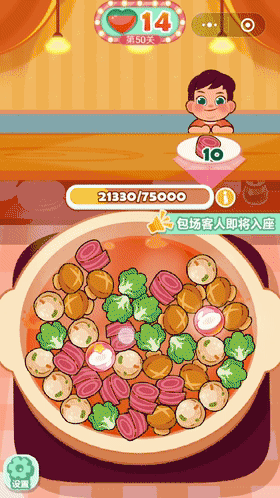第三,为了诱导玩家感受到火锅带来的美食体验,游戏加入了客人的设计,让玩家感受到火锅本身是和朋友一起热闹的吃东西。客人会具备各种各样的涮菜需求,为玩家提供更直观的短期目标,并且通过组合不同特性的客人,游戏关卡也会产生更丰富的变化。