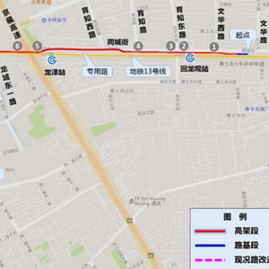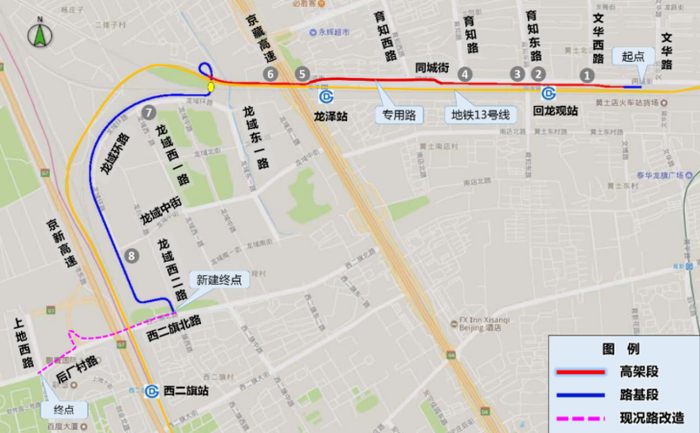 自行车专用路起点位于同成街与文华路交叉口,沿地铁13号线北侧向西经回龙观、龙泽地铁站,上跨京藏高速,下穿地铁13号线、京包铁路,沿龙域环路至西二旗北路,与现况自行车系统相衔接,终点位于后厂村路与上地西路交叉口,道路长度约6.5公里。其中新建段5.5公里,为全封闭非助力自行车专用路,禁止行人、电动自行车及其他车辆进入,原西二旗北路辅路为改造路段,约1公里,可照常行驶。