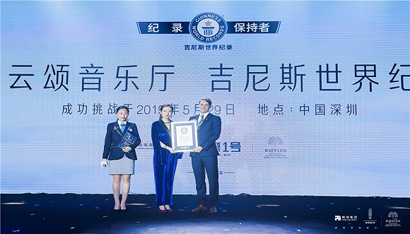 当晚,吉尼斯全球副总裁Blythe Fitzwilia也来到现场,给“悬浮云端”的云颂音乐厅正式授牌。在2019年1月22日,云颂音乐厅获得世界高层建筑与都市人居学会(CTBUH)授予“世界最高音乐厅”称号。Blythe Fitzwilia在授牌现场表示:“深圳鹏瑞集团将科技和建筑的艺术带到一个新高度。”
