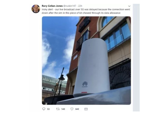 其中61岁的BBC知名科技记者Rory Cellan-Jones就在直播时将镜头给到了实现BBC此次英国首个5G网络直播的功臣之一,来自华为公司的网络设备,并表示“这是个非常关键的设备,就是它让我们英国第一次成功开启了5G实时转播!”