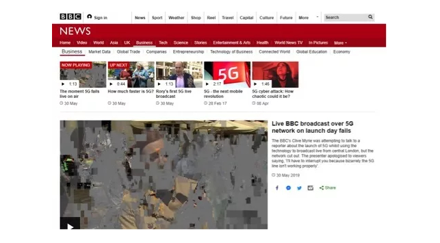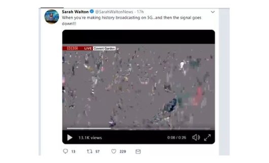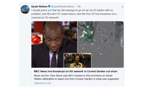 不过,他之后的BBC记者Sarah Walton在当天中午对英国首个商用5G网络的开通进行直播报道时,就比较郁闷了。