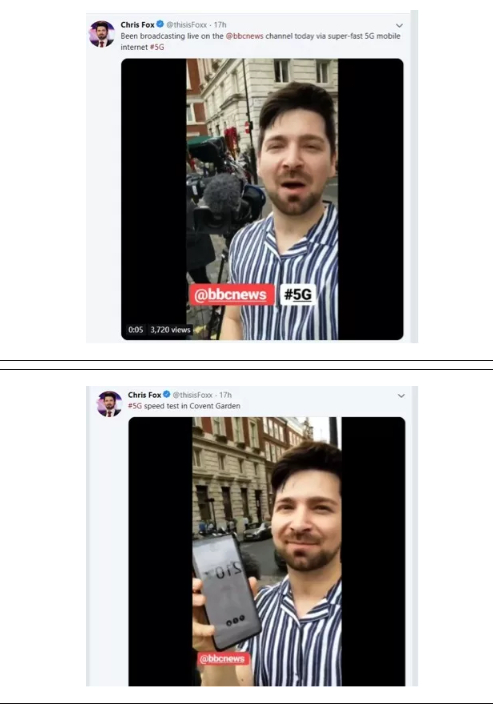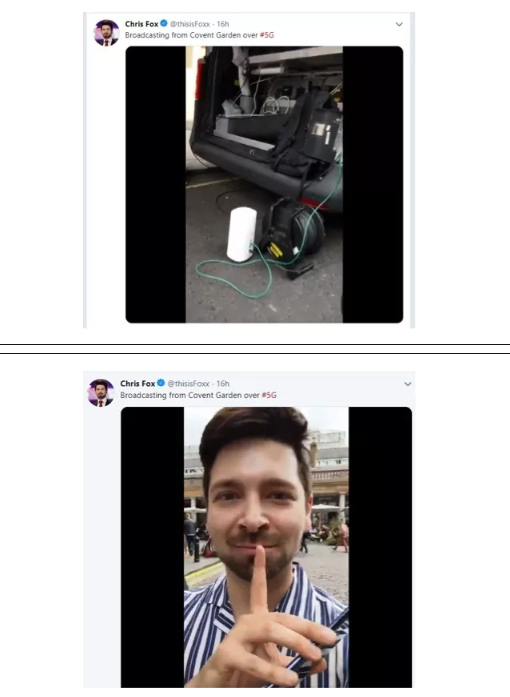 至于第三路的BBC记者小哥Chris Fox那里一切又回归了平稳,他也在自己的社交账号那里愉快地用5G发着贴文,感受着5G的高速便捷,展示着5G数倍于4G网络的网速。