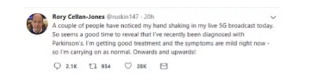 但这并不是因为这位记者大叔“激动到手抖”,而是因为他其实患有帕金森症。他自己之后也在社交账号上说明了此事,并对克服病症表现出了很积极乐观的态度。