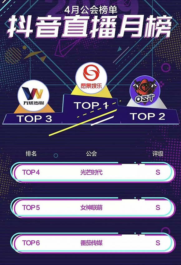 目前,抖音直播公会共分有S、A、B三级。S级公会的标准是月流水破300万,无忧传媒、OST娱乐、光芒时代都是抖音直播的S级公会,这一级别的公会在抖音直播大概有几十家。这些头部S级公会也基本垄断了抖音直播的大部分收入。