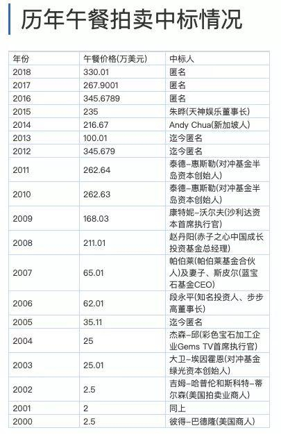 巴菲特午餐从2000年开始进行慈善拍卖,2003年开始从线下拍卖转移至线上拍卖。曾在2012年和2016年两次拍出约345.68万美元的历史最高价格,2018年成交价为330.01万美元,位居历史第二位。