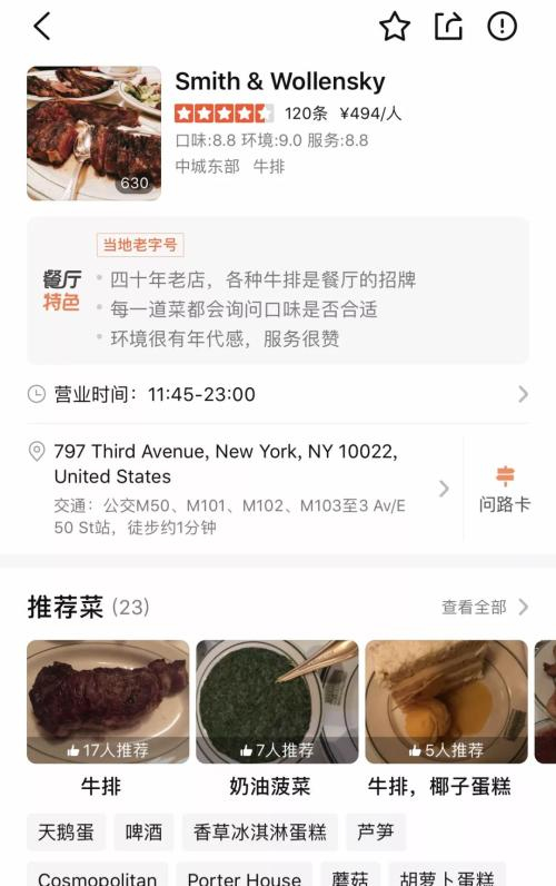 Smith &;; Wollensky餐厅餐食以牛排为主,特色餐食包括战斧牛排、西冷牛排、羊排、炸薯条、海鲜蓝等,就餐者需要提前预约。