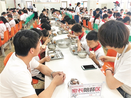 5月29日傍晚,山东省聊城市冠县金太阳学校食堂内,两名家长正在学生食堂陪餐。该县市场监管局探索实行监管人员陪餐制、学生家长陪餐制,受到家长们广泛好评。广 原摄(中经视觉)