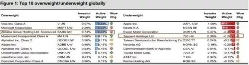 瑞银团队使用FactSet的机构持股数据,汇总了全球主动基金经理的头寸,然后他们比较了权重与“相关股票指数基准”(relevant equity index benchmark),以计算投资者权重(investor weight)和积极净权重(active net weight)。(注:active weight是指投资组合在某一证券或行业的投资份额减去基准指数(benchmark)在该证券或行业的投资份额。)