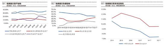 从可获得的数据看,包商银行资产端以债券投资为主,其中应收款项类投资占比在高位。同时负债端存款占比持续下降,从 2014年近60%的占比一路下滑至2017年三季度40%左右的水平。且从2016年后,包商银行主要靠同业资金维持流动性,其同业存单利率高于市场一般水平。