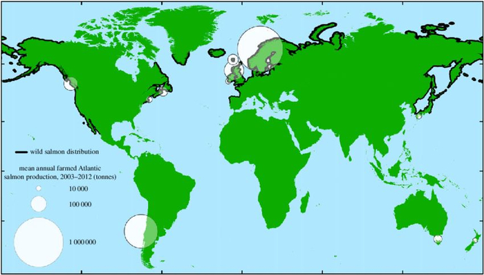 全球养殖三文鱼(白圈)和野生三文鱼分布(粗黑线)。数据来源:联合国粮食及农业组织。图片来源:DOI: 10.1098/rstb.2015.0203