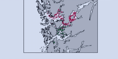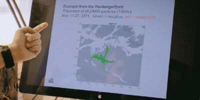 这个图像展示的是仅仅来自一个三文鱼养殖厂的海虱的蔓延。你可以看到,只需要一个三文鱼养殖场,就能感染附近大面积的野生三文鱼。