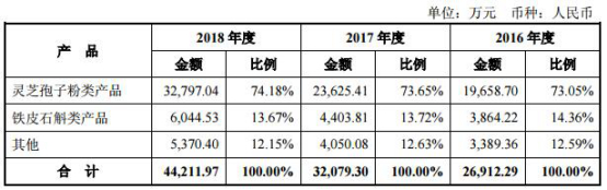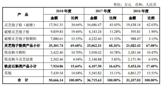而保健品类的破壁灵芝孢子粉与破壁灵芝孢子粉颗粒在销售份额上则呈现上升趋势。数据显示,2016年度、2017年度和2018年度,灵芝孢子粉颗粒及破壁灵芝孢子粉二者销售收入占公司主营业务收入的比重分别为5.05%、22.81%、35.01%。