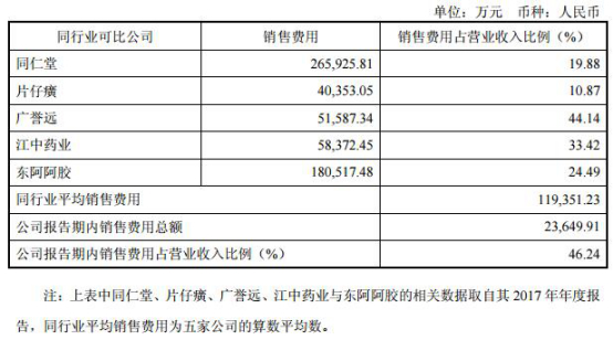 与同行业比较,寿仙谷销售费用占营业收入比例为46.24%,高于同行业可比公司。同仁堂、片仔癀、广誉远、江中药业、东阿阿胶销售费用占营业收入比例分别为19.88%、10.87%、44.14%、33.42%、24.49%。