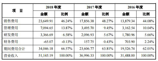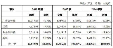 年报显示,2016年度、2017年度、2018年度,寿仙谷销售费用金额分别为1.39亿元、1.79亿元、2.36亿元,占营业收入比例分别为44.08%、48.27%、46.24%。公司销售费用主要由广告宣传费、工资、和业务招待费构成,上述费用合计金额占销售费用的比重分别为73.85%、79.03%和78.21%