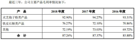 灵芝孢子粉类产品毛利率最高,最近3年都在90%以上