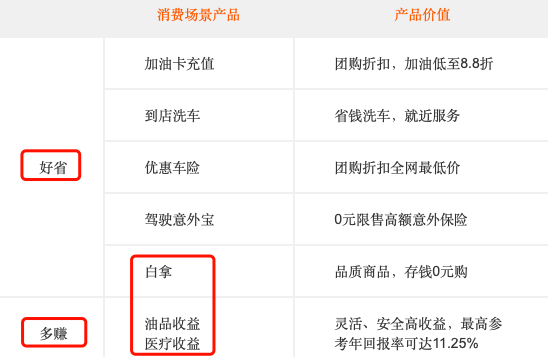 平台的商业模式主要有两种,一是可以打折消费,包括加油、充话费等;二是赚取收益,包括医疗设备的融资租赁服务(大健康商业模式)和通过石油供应链公司实现收益(大能源商业模式)。