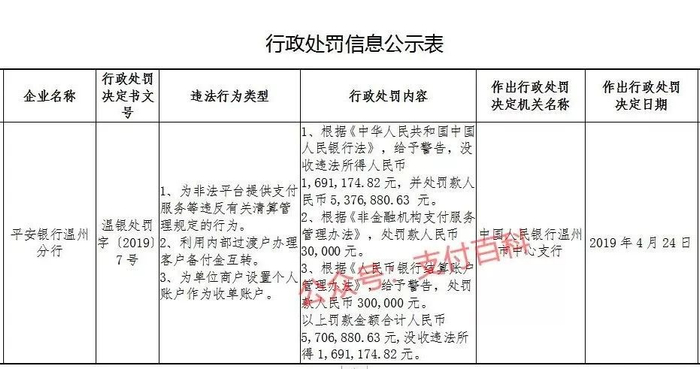 另外,就在4月底,中国人民银行温州市中心支行发布行政处罚信息公示表,表格显示平安银行温州分行由于为非法平台提供支付服务等原因被罚没739.8万元。
