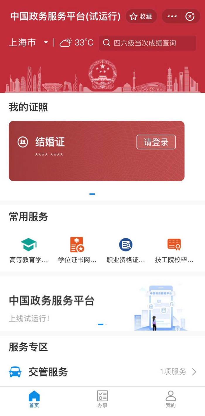 小程序使用方法很简单,在微信或支付宝首页搜索“中国政务服务平台”,点击进入即可获得电子证件、医疗、教育、交通、社保等多方面的政务服务,包括绑定结婚证、社保卡;查询学历学位证书、四六级考试成绩;查询职业资格证书;查询交通违章和出入境办证进度等;残疾人在线申请生活补贴和护理补贴;企业用户通过该平台查询企业信用、申请各类证照并跟进办事进度等。