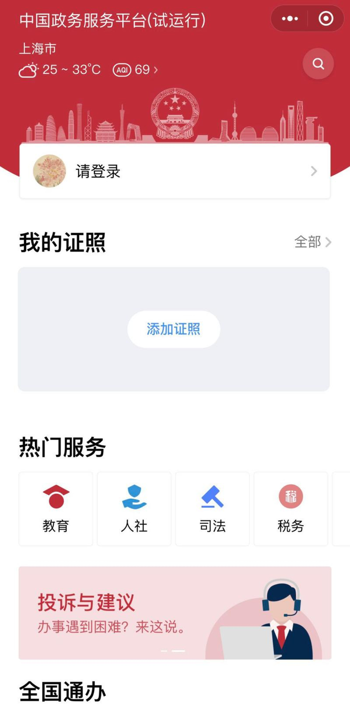 中国政务服务平台由国务院办公厅主办。作为该平台在移动端的重要入口,支付宝和微信都接入了“中国政务服务平台小程序”。小程序接入46个国务院部门、32个地方政府的142万项政务服务事项办事指南以及近200项便民服务应用。
