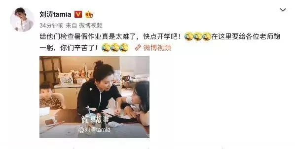 此前,刘涛在社交网站上晒出一段自己为两个孩子检查作业的视频,她还配文说“给他们检查作业真是太难了!快点开学吧!”