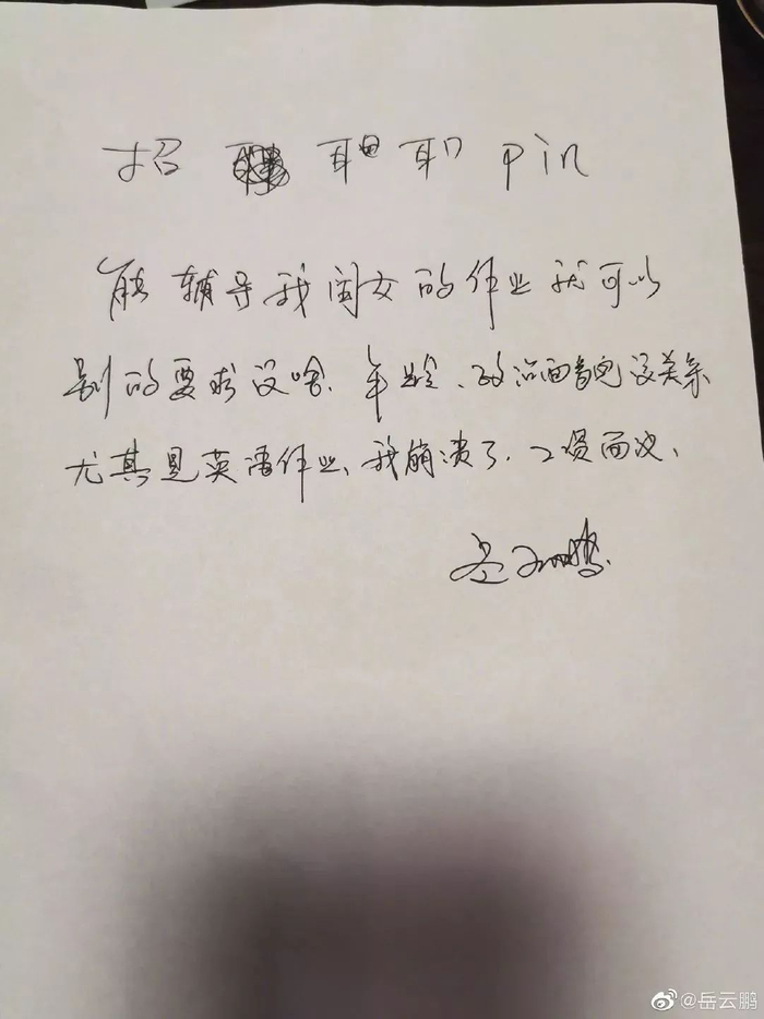 “相声圈顶流”岳云鹏曾在微博发布招聘图片并配文:“但凡有一点办法不会这样”雇人!辅导女儿!写作业!