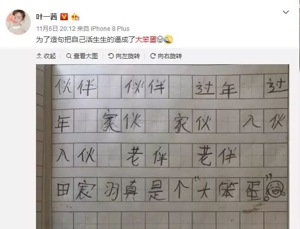可到了要写作业时,却让妈妈叶一茜哭笑不得,甚至发上微博来“诉苦”:为了造句,居然把自己骂成了“大笨蛋”。