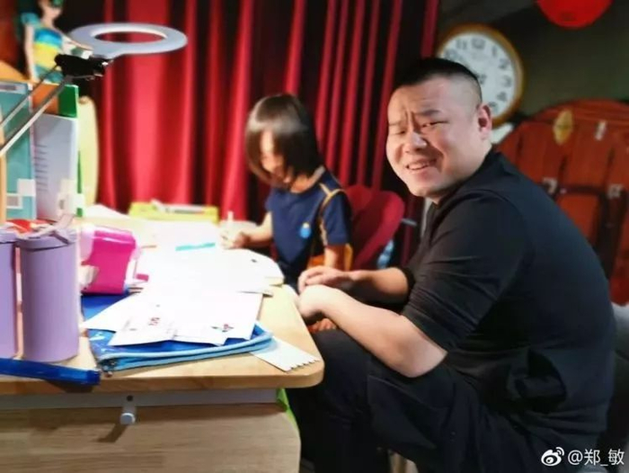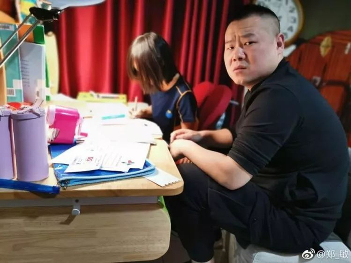照片中,女儿坐在小桌前写作业,看上去认真又乖巧。而坐在旁边的岳云鹏的表情则暴露了真实情况。
