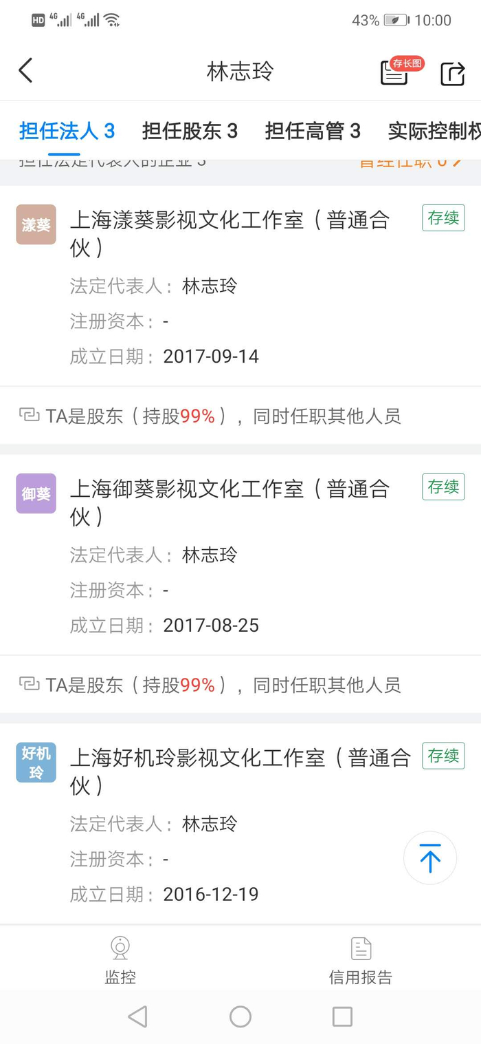 天眼查资料显示,林志玲名下有三家公司,分别是上海漾葵影视文化工作室(普通合伙)、上海御葵影视文化工作室(普通合伙)、上海好机玲影视文化工作室(普通合伙),林志玲均持股99%。