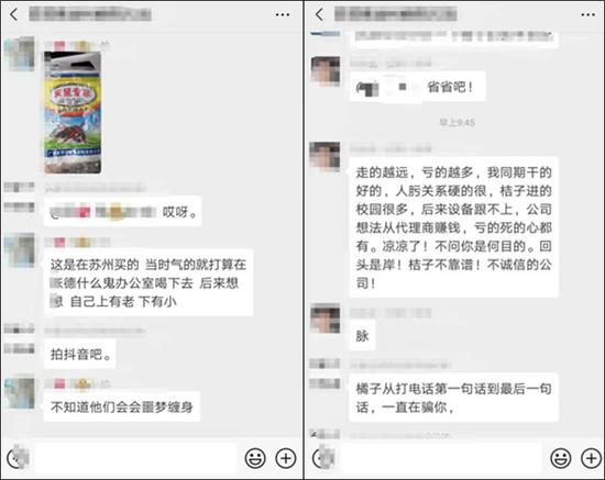 但对于代理商来说,一切都为时已晚。在维权无果后,一些投资额较大的代理商甚至有了过激的想法。一位代理商就在微信群里说,“这是在苏州买的(灭鼠药),当时气的打算在他们老板办公室喝下去,后来想想,自己上有老,下有小。”