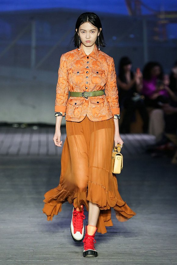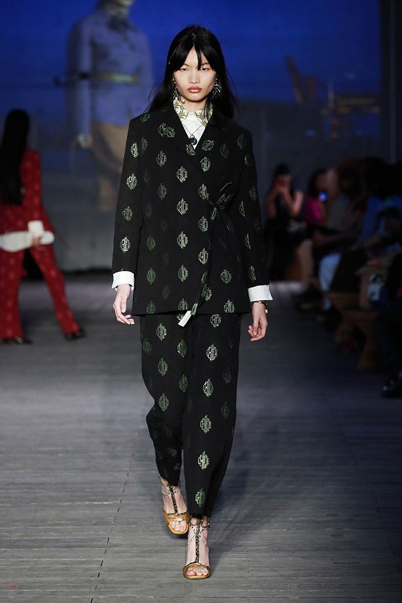 这一系列仍是Chloé的实穿摩登风格,同时更强调独立女性的形象。因此在柔美的飘逸长裙之外,更多的是廓形坚挺的西服、裤装和风衣。不过,由于有大量Chloé经典的法式艺术装饰风格几何图纹、中国风的提花和刺绣出现,显得不会过于硬朗。