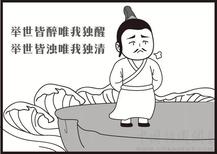 他披头散发独自徘徊在江边,面色憔悴、形容枯槁,一位渔夫路过问他:你为什么如此失意落魄?他叹气道: