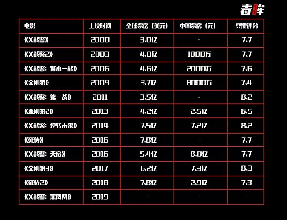 截至目前,抛开在映的《X战警:黑凤凰》和将于明年上映的衍生作品《X战警:新变种人》,“X战警系列”共有11部作品在全球范围内上映(包括3部《金刚狼》和2部《死侍》),取得了近60亿美元的票房成绩,且总体口碑表现上佳(豆瓣均分7.5分+)。更重要的是,该系列已经成功延续了20年之久,为历史第一——而如果后续作品能延用已有设定和世界观,那该纪录还将延续。