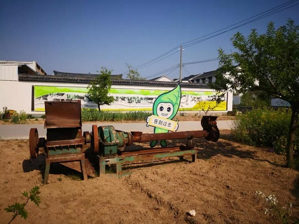 在史庄村的环境整治中,大伙还留了一台塑料破碎机在村里,牌子上面写着“告别过去”(央广记者景明摄)