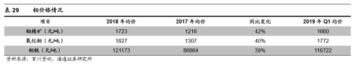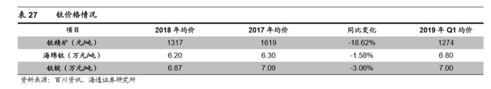 在供给侧改革、环保政策的影响下,2018年钛精矿市场价格呈现稳中趋强的态势,2019年前3月钛精矿产量108万吨,同比增长6.96%。我们认为2019年供改虽然延续但边际效应会递减,钛价主要驱动因素可能转移至需求端高端钛材放量上。