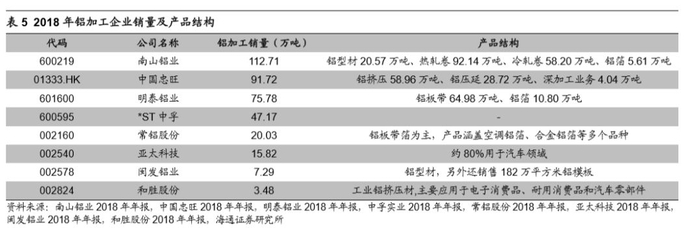 铝加工上市企业以销量来看,南山铝业、中国忠旺、明泰铝业形成第一梯队,2018年铝加工产品产量均在75万吨以上;*ST中孚销量47.17万吨处于中游位臵;常铝股份、亚太科技、闽发铝业以及和胜股份销量均在20及20万吨以下。从产品结构来看,南山铝业以铸轧卷材为主,明泰铝业以板带材为主,常铝股份几乎全部生产铝箔,其余公司绝大多数均以型材为主。