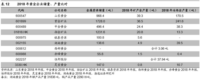 黄金上市企业产储量来看,紫金矿业以1728吨的资源储量位居国内第一,而山东黄金以2018年39.3吨的矿产金产量位居国内首位,紫金矿业紧随其后。同时矿产金产量超过20吨的公司还有中金黄金和招金矿业。