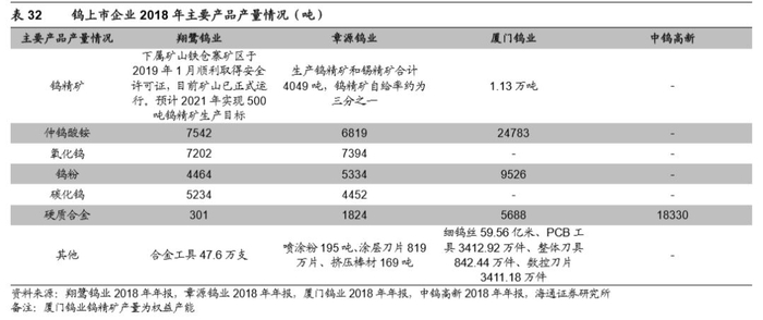 翔鹭钨业在2017年收购大余隆鑫泰钨业51%股权后,使产业链更加完善,同时实现中上游产能扩张:2018年仲钨酸铵产量同增140.15%,碳化钨产量同增44.97%。章源钨业2002年进入钨粉及碳化钨粉市场,已经实现了全产业链产品覆盖。据中国钨业协会2018年统计数据,2018年公司钨粉、碳化钨粉产品产量排名行业前两位,硬质合金产品总产量排名行业前四位。